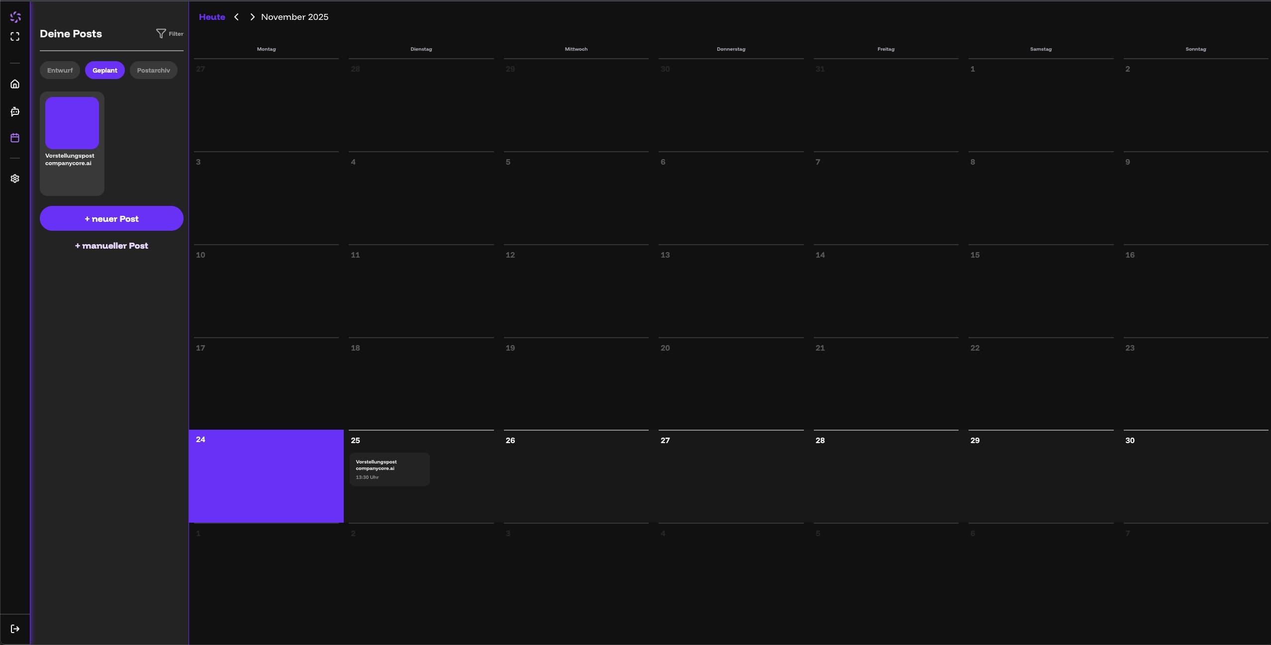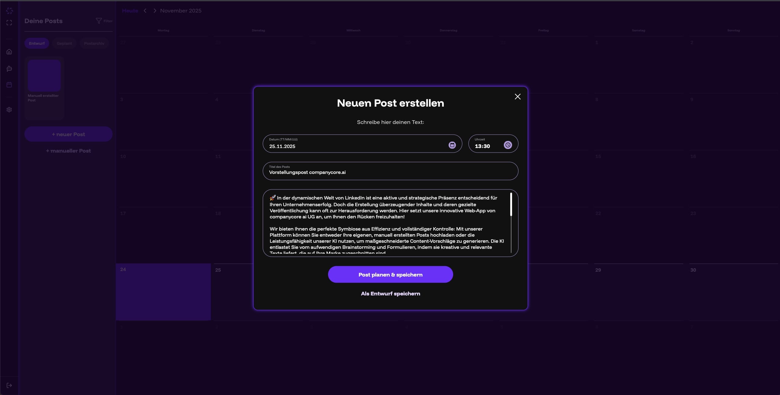 companycore ai ermöglicht registrierten Nutzern das Erstellen von LinkedIn-Beiträgen – entweder vollständig manuell oder mithilfe eines individuellen KI-Agenten, der auf Basis der vom Nutzer bereitgestellten Informationen maßgeschneiderte Beitragstexte und Medienvorschläge erstellt. [cite: 2026-01-08]